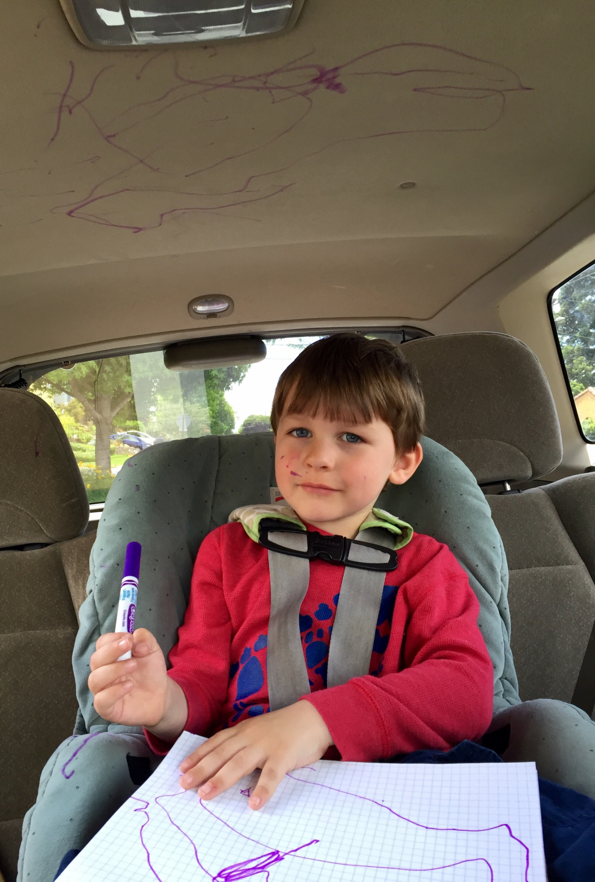 Yikes! š However, I do like Sam’s choice of color. Purple will go nicely with his little sister. And I do like the artistic “K” he drew on the headliner.