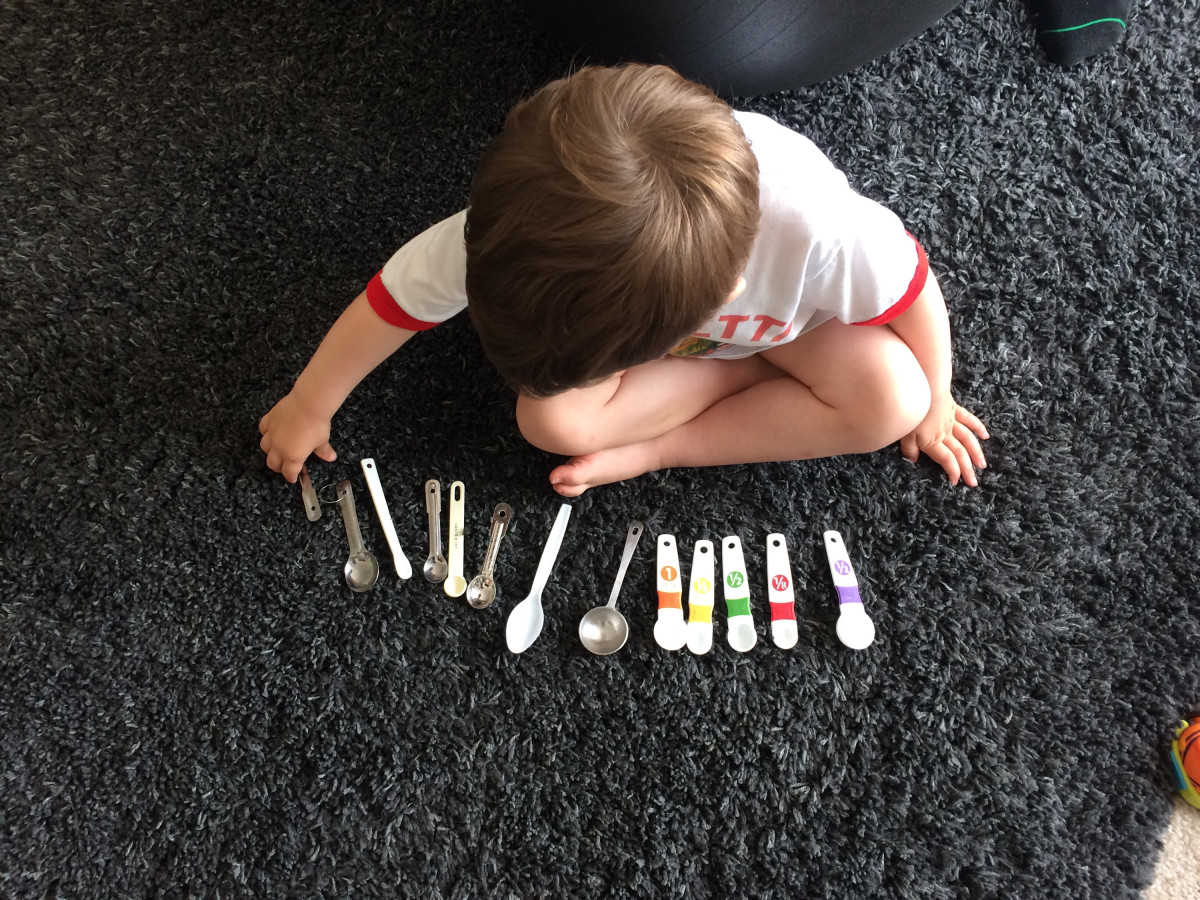 Little one studying spoons. Future gourmet? Zen master? Or kid on rug. Time will tell.