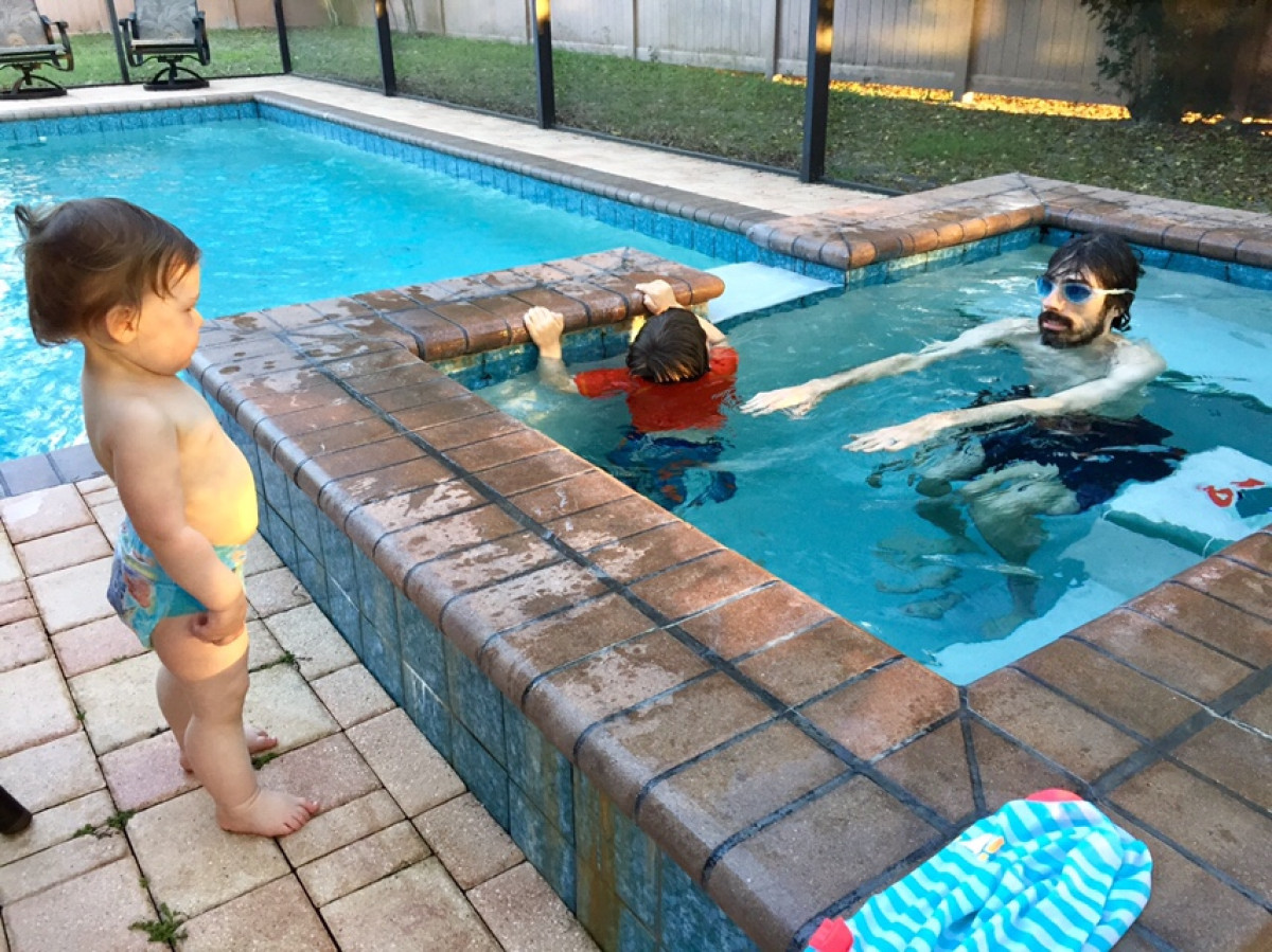 I LOVE this picture!! Not sure whether Norah was more apprehensive about the water or her alien father with pressed hair and blue goggles! Great pic snapshot from sweet family time in my backyard. Kudos to Mary for this one! 🙂