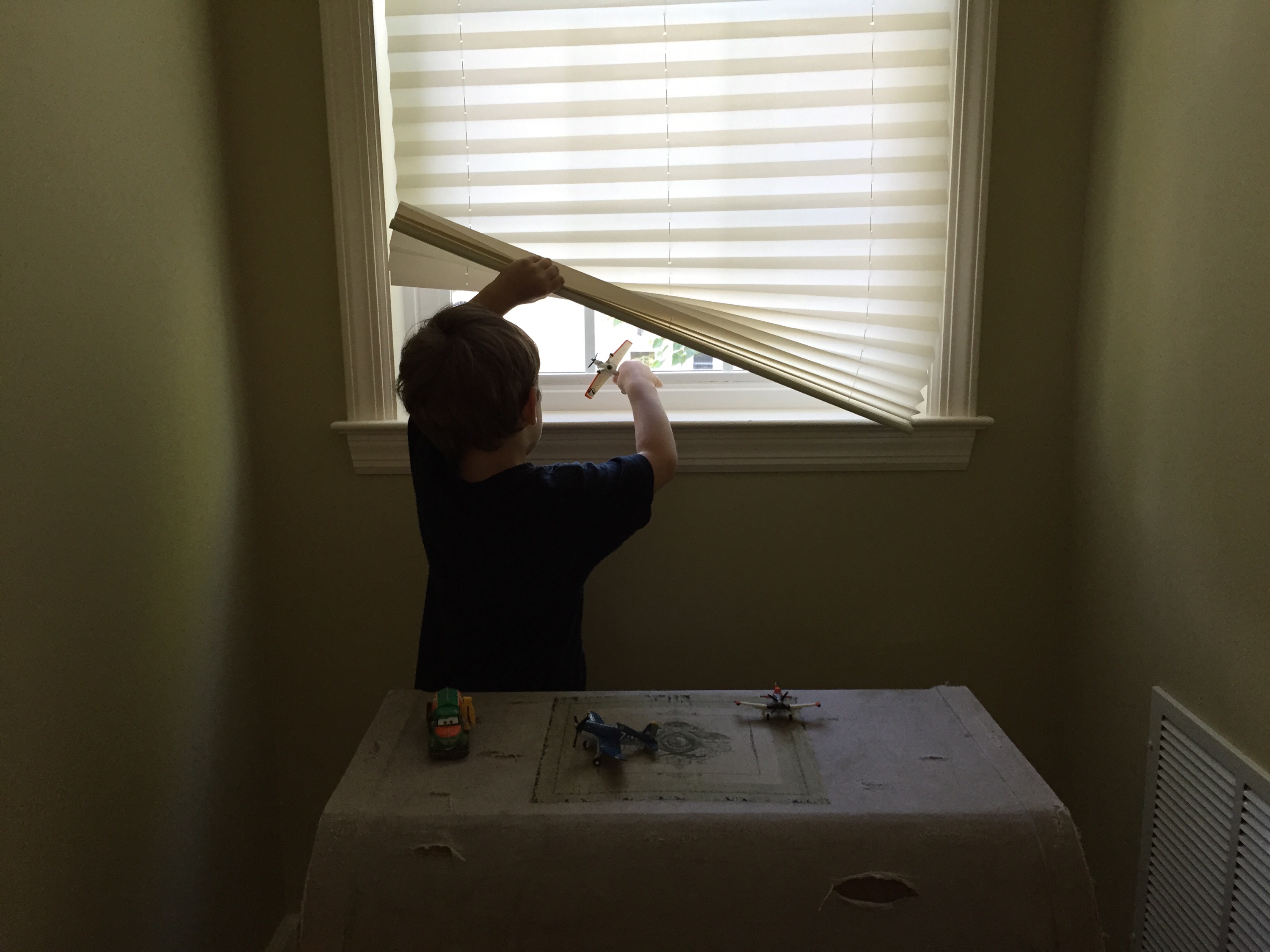 Really interesting photo. A portfolio piece. Love the way Sam is holding up the blinds so his plane can get to the sky. Is that an “airport” behind him?